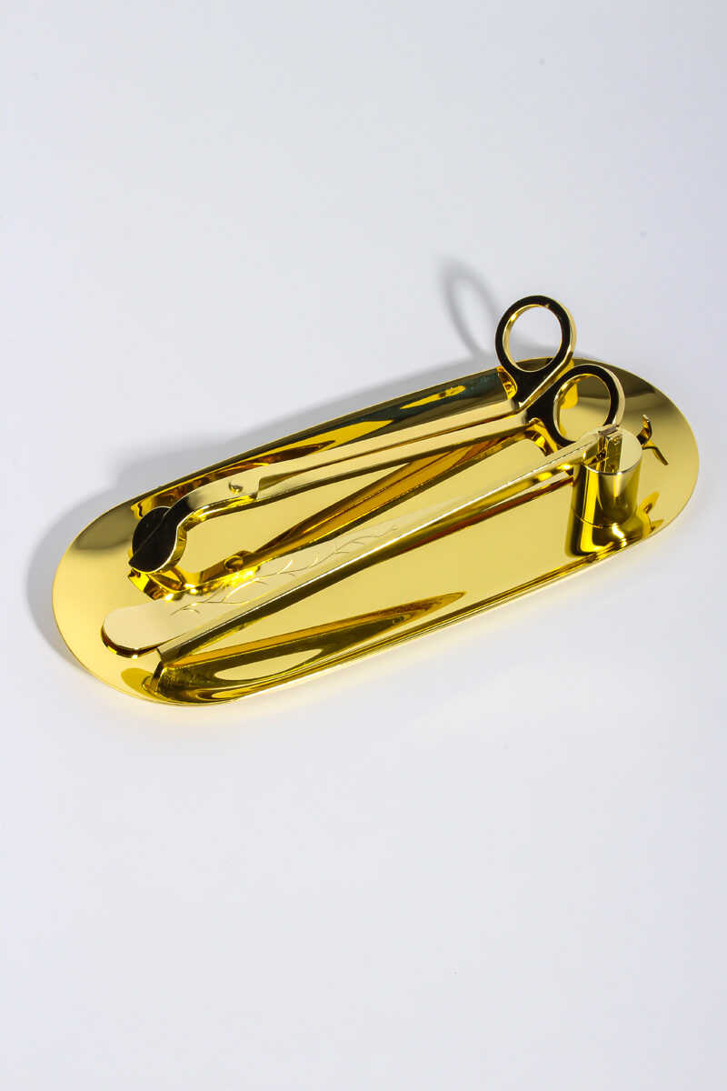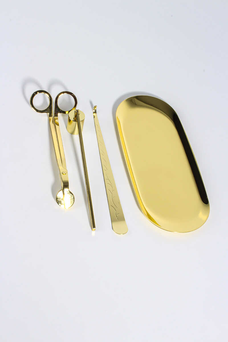 Mum fitili makası, düzenleme cımbız kancası, söndürme çanı ve sunum tepsisi