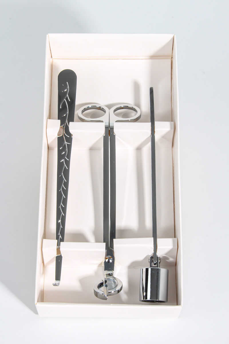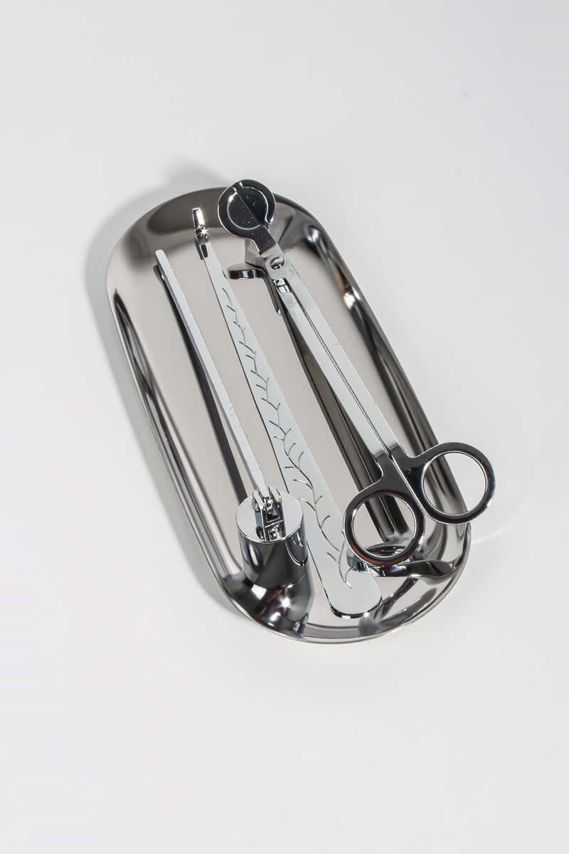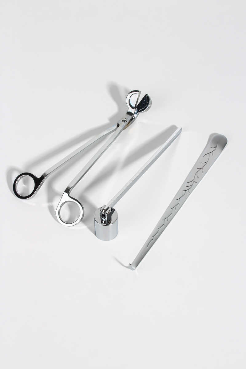 Mum fitili makası, düzenleme cımbız kancası, söndürme çanı ve sunum tepsisi